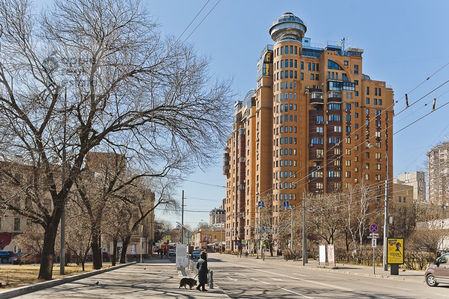 Long-term rental apartment at address: Средний Тишинский переулок 5. New modern building. Total size - 107 sq.m, 3 rooms, rooms size: sq.m, Kitchen - 36 sq.m. Ceiling height 3.2 m. Apartment located on 15 floor of 18 - storied building. Fenced territory with...